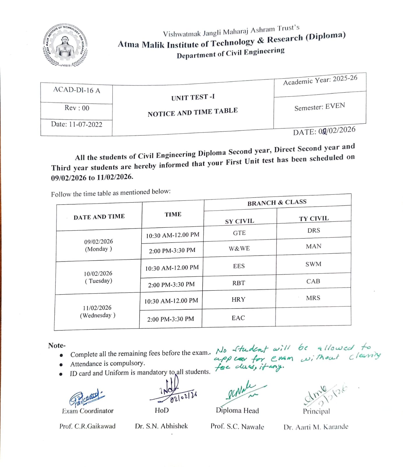 Atma Malik Institute of Technology and Research established in the year 2011. This College is approved by A.I.C.T.E. New Delhi recognized by D.T.E. & Govt of Maharashtra and Affiliated to University of Mumbai(For Degree), Affiliated to M.S.B.T.E. (For Diploma). It offers full-time UG and After 10th Diploma programs in Engineering with specializations such as Civil, Computer Engineering, Mechanical Engineering, Artificial Intelligence & Machine Learning.